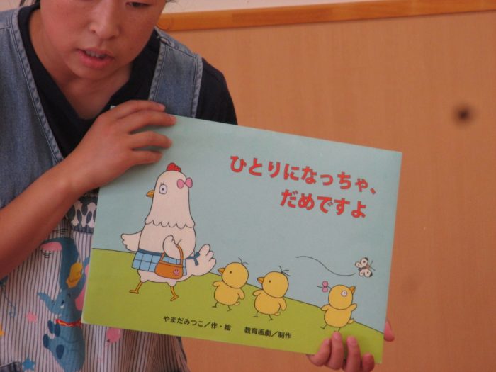 初めに、『ひとりになっちゃ、だめですよ』という紙芝居を読んでもらい、❝知らない人・怖い人が保育園やみんなの遊んでいる公園に来たらどうすればいいのか⁇❞を先生と確認しました。