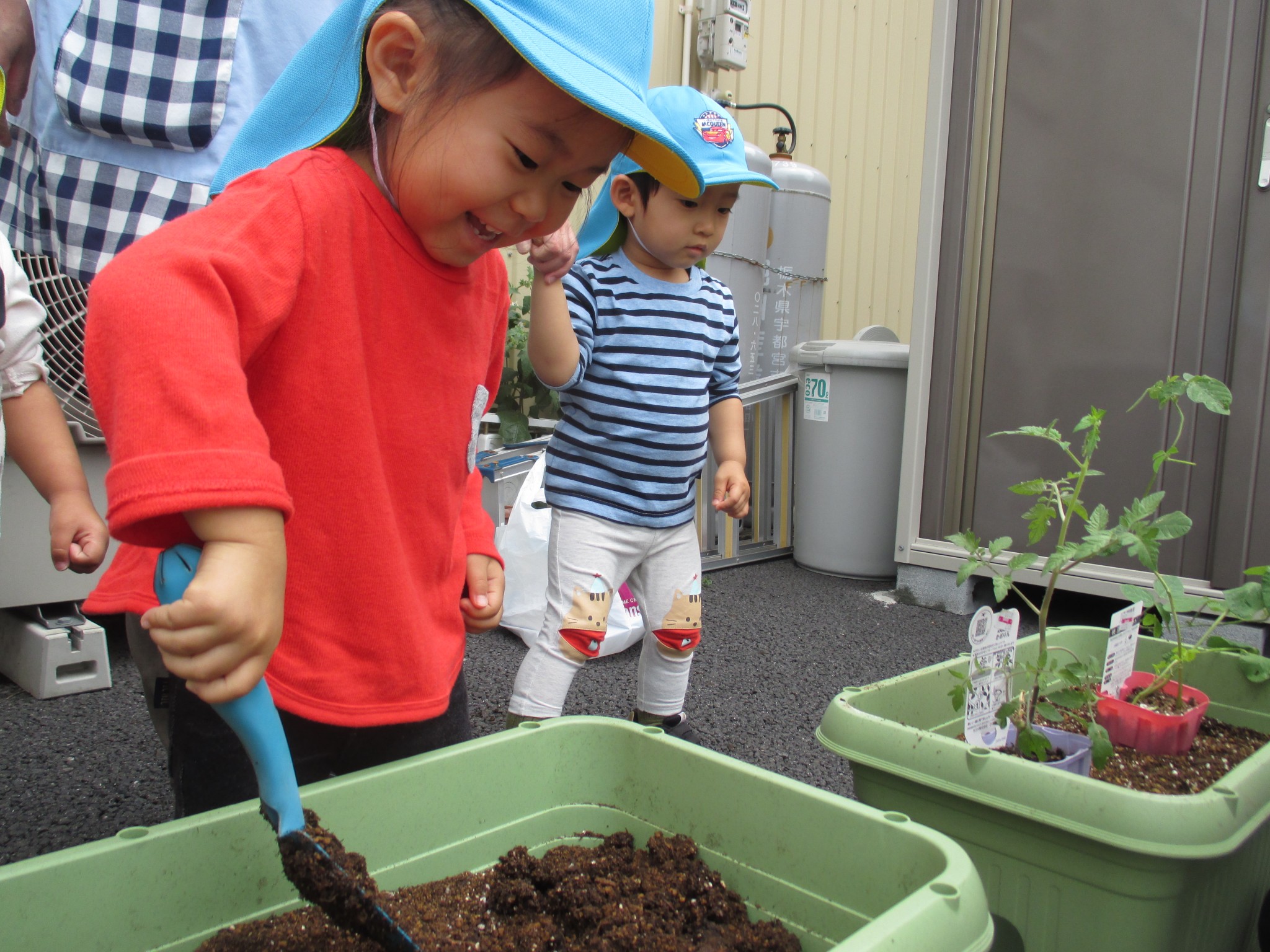 梅雨の晴れ間を利用して にじ組のお友だちが野菜の苗を植えました(*^。^*)