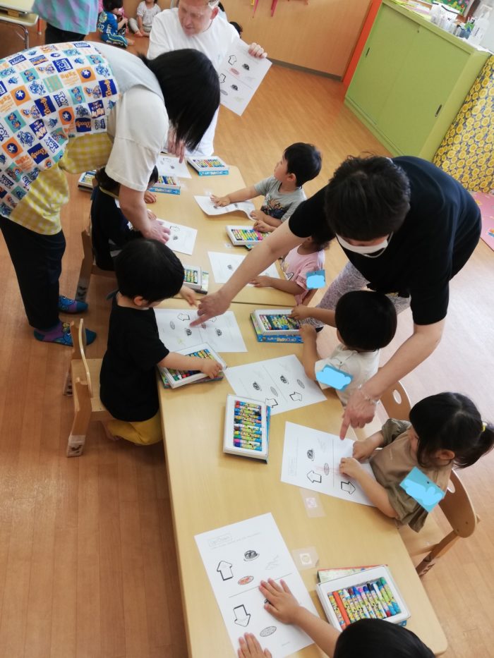 にじぐみでは、ワークシートも行っています。先生が出すカードと同じ絵を探して クレヨンで塗る事を 楽しんでいます。