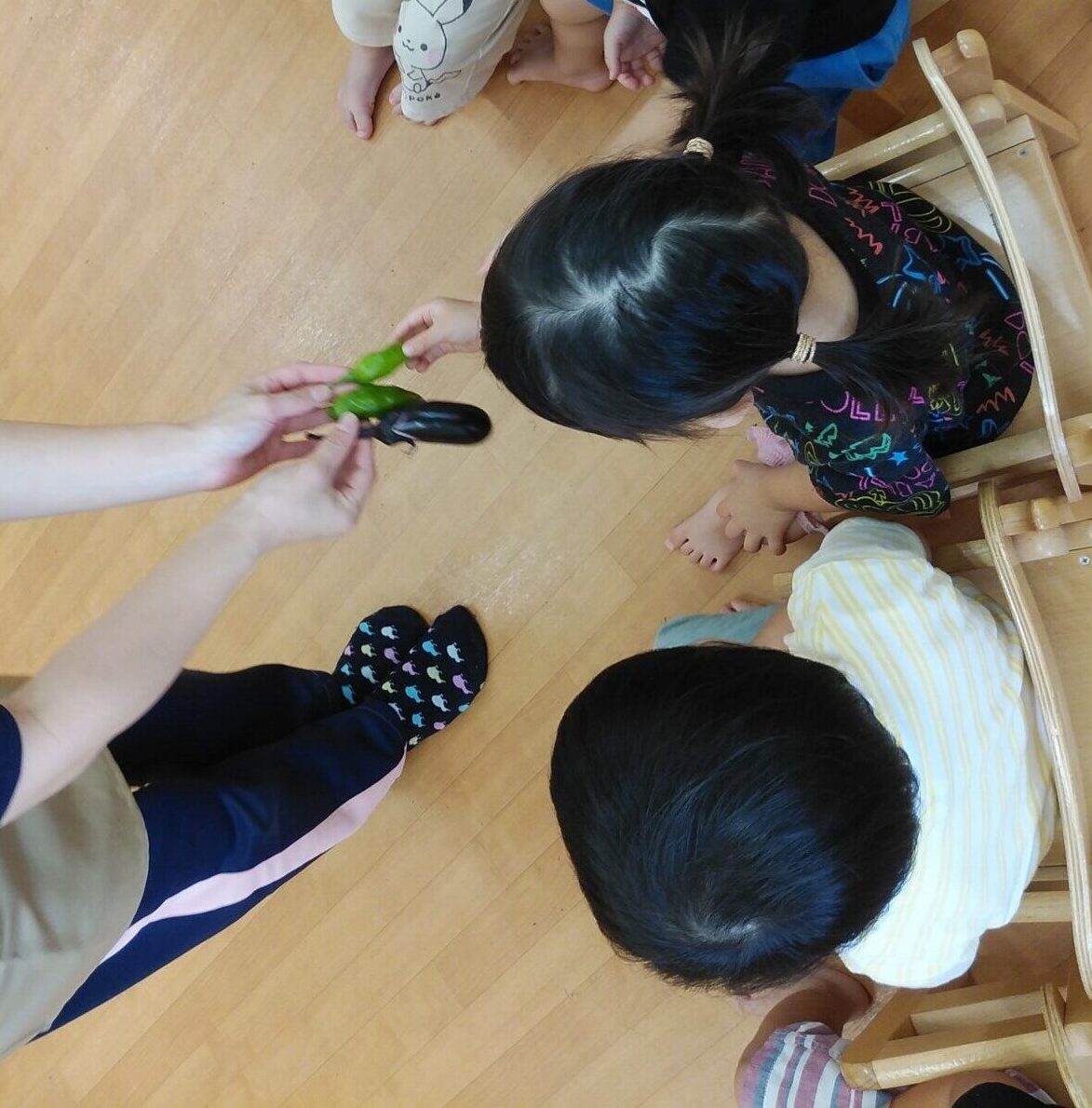 かっこいいお返事を聞き、本物のピーマンとナスを