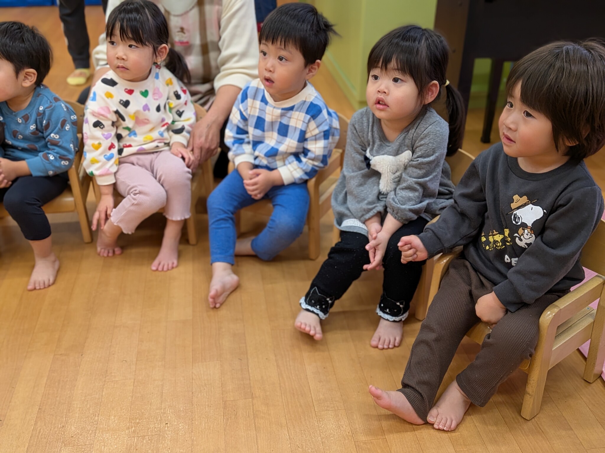 園長先生から、ひなまつりについてのお話をしてもらい、よく耳を傾けて聞く子どもたちの姿がありました。